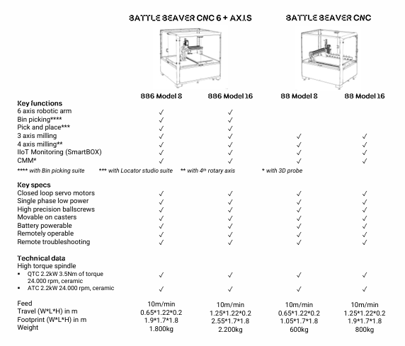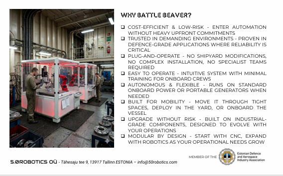 Battle Beaver is a compact AI-driven robotic manufacturing cell that integrates advanced automation into a footprint of only 4 m². Combining AI-based 3D vision, a 6-axis robotic arm, and a high-performance CNC milling system, it enables autonomous part detection, handling, machining, and unloading. The system delivers industrial-level precision without requiring specialized infrastructure, factory upgrades, or major capital investment. Its compact design and efficient automation reduce energy consumption and support flexible, distributed manufacturing environments.