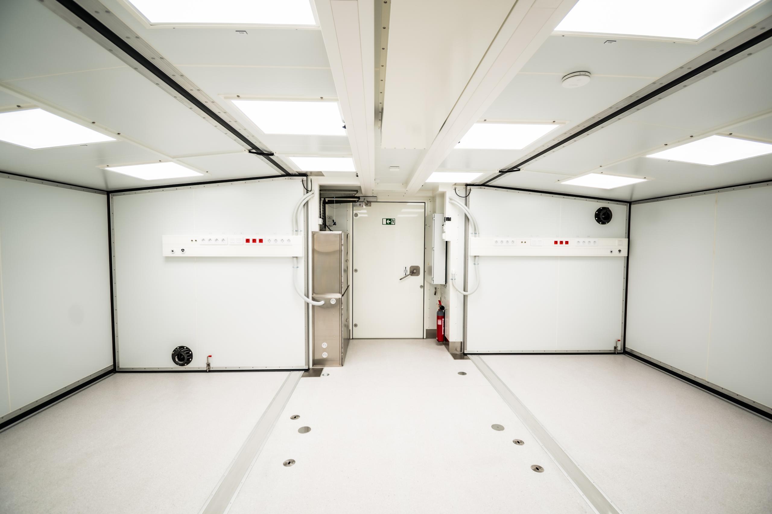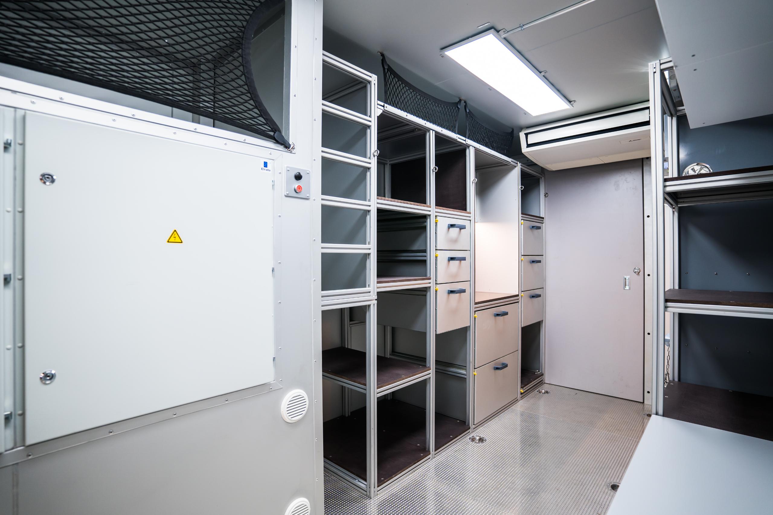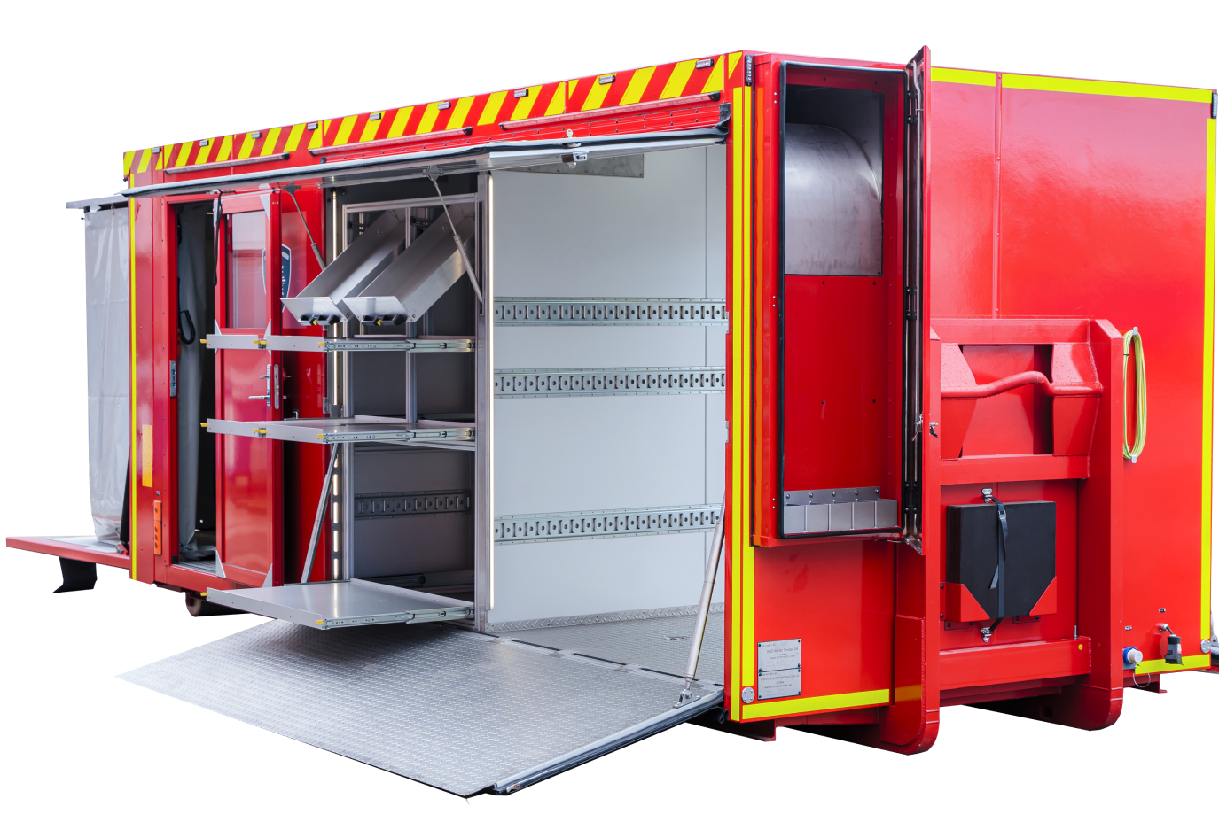 The Function Shelter is built on a lightweight hooklift frame according to the Swedish SS3021 standard, using high-strength steel combined with insulated sandwich panels and aluminium sheets for enhanced durability and thermal protection. A hydraulic ramp at the rear enables efficient loading and unloading. The shelter integrates a flexible electrical system for field operations, supported by a 24 VDC battery for autonomous deployment and reliable startup. Multiple configurations are available, tailored for rescue services, CBRN incident response, urban search and rescue, and specialized police bomb squads.