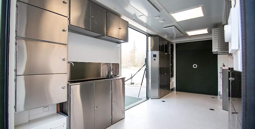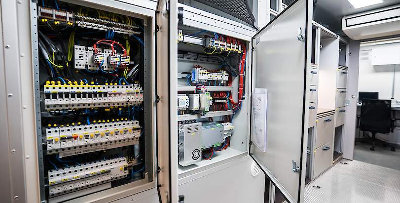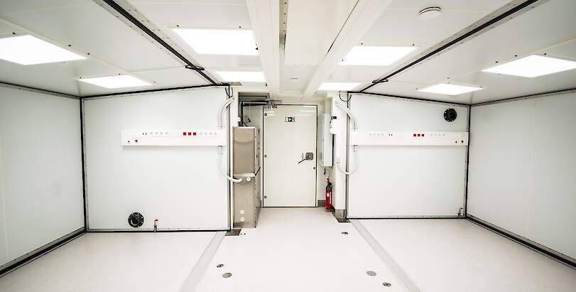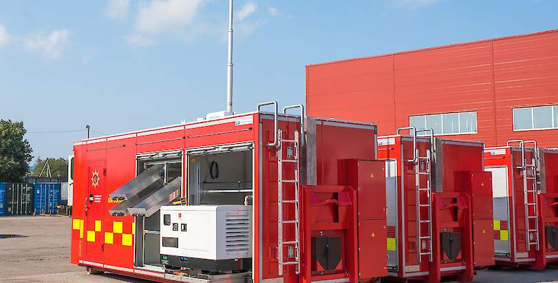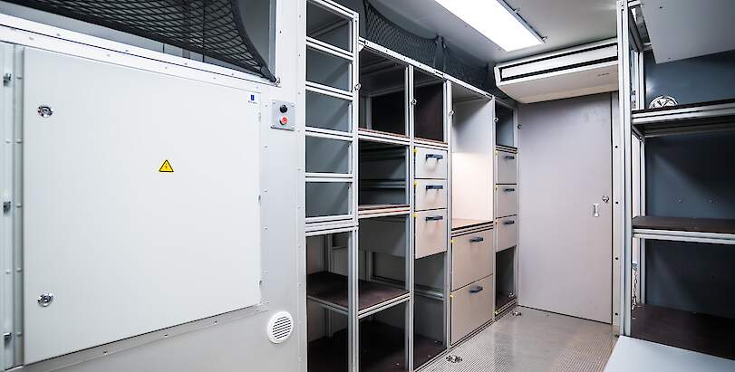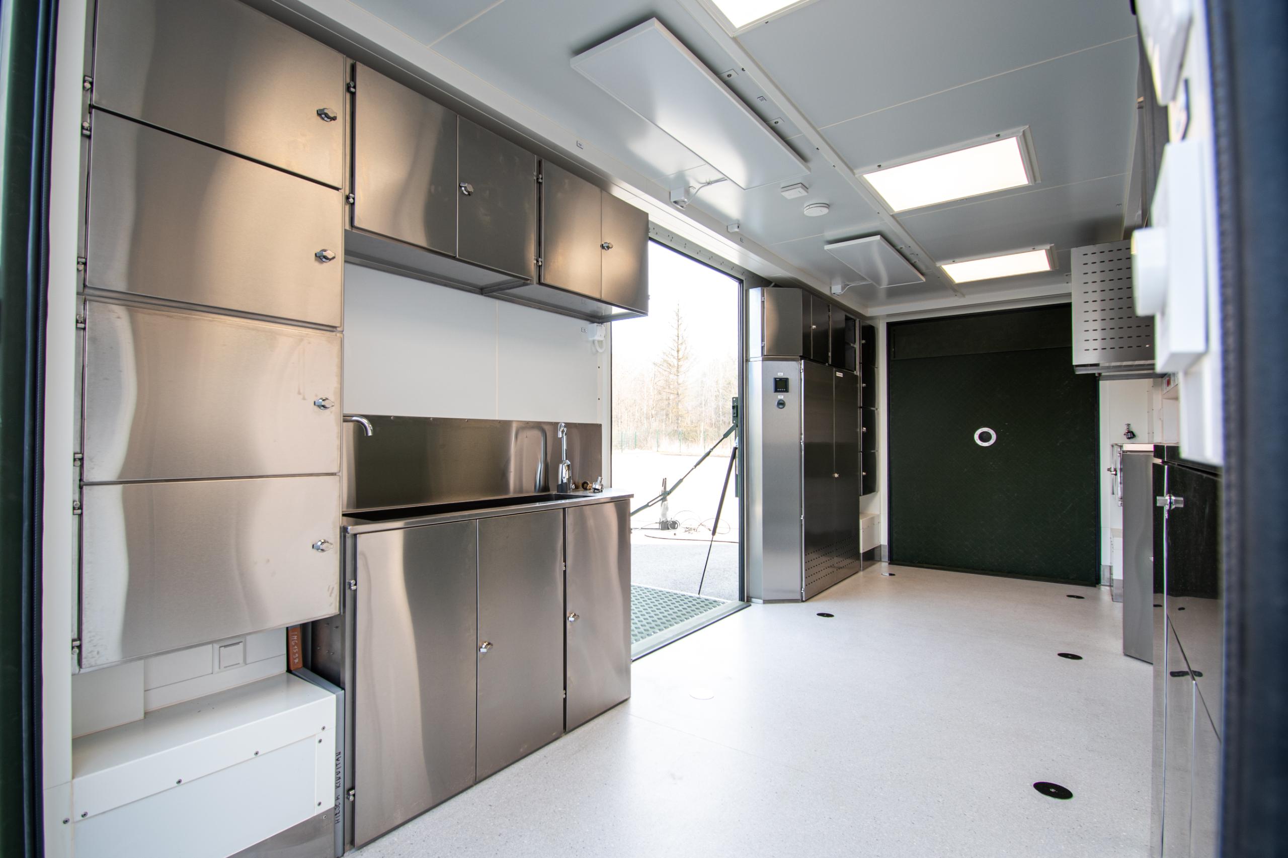 The Function Shelter is built on a lightweight hooklift frame according to the Swedish SS3021 standard, using high-strength steel combined with insulated sandwich panels and aluminium sheets for enhanced durability and thermal protection. A hydraulic ramp at the rear enables efficient loading and unloading. The shelter integrates a flexible electrical system for field operations, supported by a 24 VDC battery for autonomous deployment and reliable startup. Multiple configurations are available, tailored for rescue services, CBRN incident response, urban search and rescue, and specialized police bomb squads.